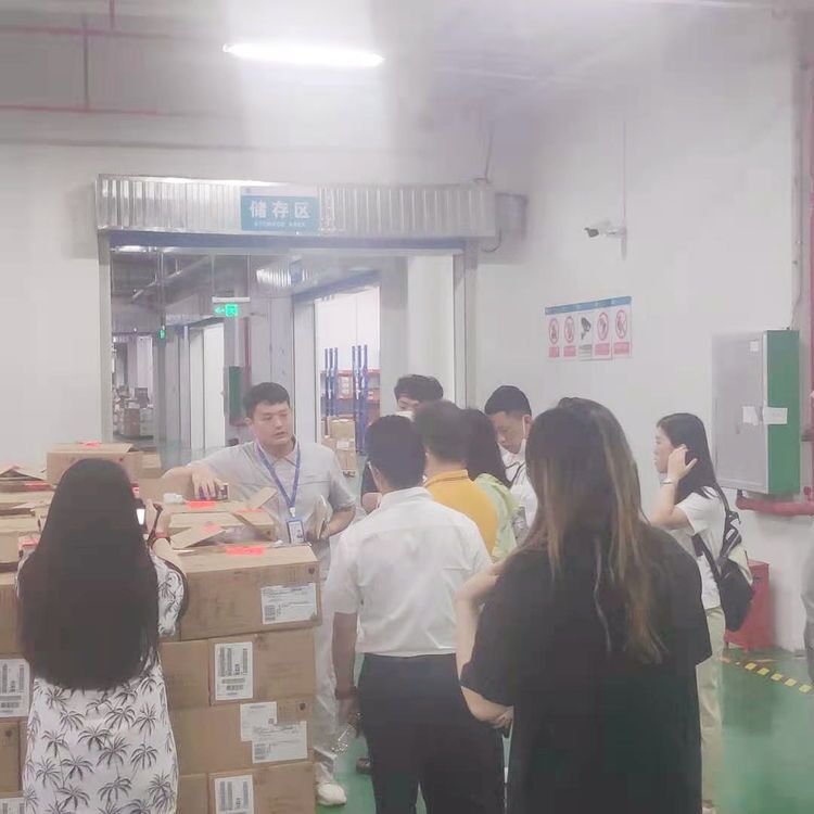 工作人員帶領(lǐng)考察團(tuán)參觀入駐企業(yè)的倉儲(chǔ)區(qū),了解倉儲(chǔ)運(yùn)營流程。